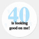 40 es "Me Gusta bien": camisetas, tazas, botones, cartas y otros artículos de regalo y ropa de 40 años con diseño de texto azul y negro con globos pequeños.