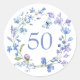 50 cumpleaños pegatina azul floral clásico redondo. Es fácil cambiar el texto. diseño de flores silvestres acuáticas de bonito para primavera y verano.