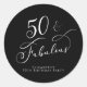 Un pegatina negro bonito para sus invitaciones de fiesta de 50 años, correspondencia y favores de fiesta. Este elegante diseño de moda presenta "50 & Fabulous" escrito en un guión de caligrafía blanca. Personalizar con su nombre.
