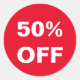 50% de descuento en pegatinas para promociones de ventas de tiendas. Etiquetas de descuento promocionales de glosas redondas y personalizables para empresas. Agregue su propio valor porcentual de personalizado y colores de fondo. Materiales de marketing DIY para tiendas, comercios minoristas, tiendas, eventos, ofertas especiales, envío de promociones, encuentros, etc. Ejemplo de medio precio rojo y blanco. También útil como sellos para sobres.