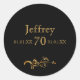 Un pegatina para una elegante fiesta de cumpleaños 70 con temática negra y dorada. Plantillas para un nombre, edad, fecha de nacimiento y fecha del aniversario. Letras de colores dorados, escritura de estilo bloque clásico. Color de fondo negro. Decoración clásica de remolinos. Puede cambiar el color de fondo para que coincida con el tema. Haga clic en personalizar y, a continuación, seleccione un color de fondo a la derecha.