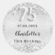 Fondo de color plateado falso decorado con confeti. Personalice y agregue una fecha y un nombre. Cartas negras. 75 escrito con un tipo de letra de estilo globo.