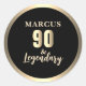 90 & Legendary Gold 90th Birthday Party Sticker. Celebrate Marcus's incredible 90th birthday with this elegant black and gold '90 & Legendary' design. Featuring a sophisticated metallic gold border and typography on a black background. It's the perfect way to honor a truly legendary individual reaching this significant milestone. Ideal for party favors, gift tags, invitations, or adding a personal touch to any celebration decor. The luxurious gold texture adds a touch of prestige, ensuring your celebration stands out. Customize with any name.
