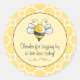 Este adorable pegatina de abejorros redondos favorece a un adorable y alegre abeja amarilla y negra con personalizado negro "¡Gracias por zumbar para estar aquí hoy!" texto que puedes personalizar para tu ocasión, un acento de pergamino punteado negro y un patrón dorado de fondo de abeja amarilla.