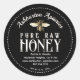Elegante diseño vintage en negro para apicultores más pequeños que buscan un aspecto elegante y no comercial. Los nombres de sus colmenas y productos están escritos en fuentes decorativas. Añada los nombres de Beekeeper, ubicación, sitio web, teléfono y peso neto de miel en onzas y gramos.