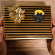 Un fondo negro chic decorado con miel dorada que gotea. El texto: Abeja feliz con un estilo de letra dorada con florituras. Personaliza y añade tu nombre, apellido. Para fiestas de verano, bodas, barbacoas en el jardín.