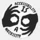 Un pegatina blanco redondo con un tipo de letra todo-mayúsculas en negro y un símbolo internacional para la interpretación del lenguaje de señas de gran tamaño y en el centro. El texto es redondo con la forma del pegatina. Dice: "LA ACCESIBILIDAD ES UNA NECESIDAD"