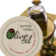 Pegatina Redonda Aceite de oliva picante y picante en el mercado de