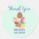 Un evento personalizado gracias pegatina ilustrado con un tazón de helado con 3 deliciosas copas cubiertas de rociadas de caramelo. También hay un cono de helado con 3 cucharas de chocolate, vainilla y fresa. Un bol de postres lleno de helado de sabor neopolitano con una deliciosa cereza encima.