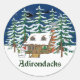 Cabaña de troncos cortados por altos pinos de la montaña Adirondack y nieve.