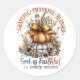 Diseño pacífico y colorido con una hermosa escena otoño/otoño con calabaza y flores. El colorido texto inspirador dice: "Agradecido gracias bendecido. Dios es fiel en cada estación". Este diseño está disponible en una amplia variedad de productos.