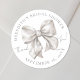 Una etiqueta clásica y elegante de lluvia de regalos de boda con un lazo blanco de acuarela suave de gran tamaño. En la parte superior, tiene el nombre de la novia y "Lluvia de regalos", y en la parte inferior, la fecha. En el centro, junto al lazo blanco, está "¡Gracias!" en escritura elegante. Este diseño simple y atemporal de lluvia de regalos utiliza texto gris en una mezcla de tipografía serif y script, creando un aspecto refinado pero encantador. Puedes personalizar los colores de la fuente y el fondo para que se adapten a tu estilo. Etiqueta de agradecimiento personalizada con tema de lluvia de regalos de boda con lazo blanco de acuarela elegante.