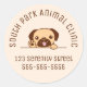 Simple ilustracion personalizado de un alegre perro de cerdo, lengua fuera, mirando desde detrás de un divisor. Sólo sus patas delanteras y la cabeza son visibles. Una pata se levanta en un gesto de ola. Personalizar con su propio nombre o mensaje.