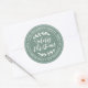 Pegatina redonda de regreso a la dirección de vacaciones de Navidad rústica y moderna con tu nombre y dirección en tipografía blanca elegante que presenta el texto 'Feliz Navidad' en caligrafía manuscrita con un toque elegante de follaje rústico sobre un fondo verde polvoriento. Simplemente agrega el nombre de tu familia y dirección. Diseñado exclusivamente para ti por Happy Dolphin Studio. Si necesitas ayuda o productos coincidentes, por favor contáctanos a través del chat de nuestra tienda. Felices fiestas y Feliz Navidad!