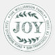 Pegatina de dirección de vuelta familiar de Navidad con su nombre y dirección en tipografía elegante de color verde oscuro que presenta el texto ALEGRÍA en tipografía manuscrita con un toque elegante de follaje rústico. Simplemente agregue su nombre y dirección. Diseñado exclusivamente para usted por Happy Dolphin Studio. Si necesita ayuda o productos coincidentes, por favor contáctenos a través de nuestro chat de tienda. ¡Felices fiestas y Feliz Navidad!