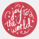 La caligrafía "alegría para el mundo" está en blanco contra un fondo rojo pintado con mucho encanto. Pegatinas festivos diseñados para igualar nuestra alegría con las tarjetas fotográficas del feriado mundial.