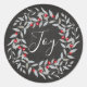 Pegatinas de navidad rústica con antecedentes en pizarra, la palabra "alegría" con letra caligráfica escrita a mano y navidades de bayas verdes y rojas en festividades.