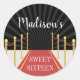 Los pegatinas personalizados con una alfombra roja y fondo de cuerda de terciopelo son perfectos para tu dulce de tema de Hollywood dieciséis, mitzvah de murciélago o celebración de quinceañera. Personalizar con el nombre del invitado de honor y tipo de evento con letras blancas. Diseñado para coordinar con nuestra colección especial de invitaciones a eventos glam de Hollywood.