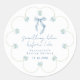 Sticker elegante para ducha de novia para tus invitaciones, recuerdos y tarjetas de agradecimiento con un borde de concha de puntos verdes caprichosos y acuarela floral azul, un lazo coqueto azul delicado en acuarela, "algo azul antes de hacerlo" presentado en una elegante tipografía de caligrafía azul, y el nombre de la novia y la fecha de la ducha en tipografía serif clásica.