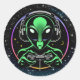 Pegatina Redonda Alien jugando videojuegos con fondo estelar