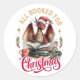 A festive and cheerful Christmas holiday design showcases a smiling red dragon wearing a Santa hat. The dragon stands behind a stack of books, engrossed in reading the top one. Beside the books are candy canes, pinecones, holly berries, and a steaming cup of cocoa. Golden stars surround the scene, while colorful text reads: "All booked for Christmas." This design is offered on a variety of products, making perfect gifts for book lovers.