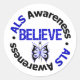 Camisetas y regalos de ALS Awareness "BELIEVE" diseñados en forma circular con texto de estilo grueso y una llamativa mariposa de pinstripe azul y blanco para promover la conciencia sobre la ELA. Visita nuestra tienda para ver exclusivos tés de concientización de ALS, regalos de ALS y ropa de ALS.