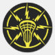 ¡Peligro! Reproductor de lacrosse de alto voltaje. Símbolo de estilo superhéroe de Guay de cabeza de palo de lacrosse con tornillos relámpago disparando desde todos lados.