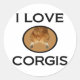 Un lindo círculo redondo con una fotografía de un lindo culo de conejito de corgi y sus piernas estiradas detrás de ella con las palabras ME ENCANTA EL CORGIS. A los dueños de Corgi, mamá y padres por igual les gustará este regalo de bonito corgi.