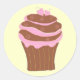 Un bizcocho de chocolate con remolinos de fresa y corazones rosados encima.