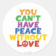 AMOR Y PAZ. Este diseño muy sencillo, original y colorido dice: NO PUEDES TENER PAZ SIN AMOR. Una señal de paz se encuentra dentro de la ‘O’ de la palabra Amor. Abogar por la paz mundial, la paz en la Tierra, la paz con nuestros enemigos, la paz en nuestros corazones. Gran tema para celebrar el Día Internacional de la Paz, establecido por una resolución de las Naciones Unidas en 1981 y a veces llamado Día Mundial de la Paz. Este artículo es un regalo único para las mujeres y los hombres, los niños, los bebés, los niños y los chicas. Compra otros artículos en la tienda verde donde puedes comprar en línea - desde pegatinas, botones, imanes, tazas, gorras, posters, ornamentos y estuches de teléfonos celulares a polos, sudaderas, capuchas, otras prendas de vestir y mucho más!