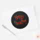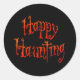 Texto "Happy Haunting" en letras naranjas espectrales, con unos cuantos ojos fantasmales, un diseño humorístico para una Halloween inquietante