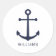 Moderno Pegatina de redondeo náutico Minimalista con ancla azul marino con nombre personalizado en azul marino moderno sans serif estilo de letra en fondo blanco. Perfecto para fiestas de temática playera, regalo de vacaciones y cualquier ocasión especial.