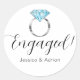 Estas pegatinas personalizadas dicen ¡Comprometidos! junto con un anillo de compromiso de diamante azul con banda de plata y los nombres de la novia y el novio en la parte inferior. ¡Perfecto para una fiesta de compromiso o anuncio de guardar la fecha!