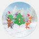 Las galletas son parte de los adornos de este árbol personalizado. Animales personalizados con sombreros de Santa están bailando alrededor de un árbol de Navidad. Hay un árbol gracioso con un sombrero de Santa, un pájaro en el árbol, zorro, ciervo, ratón y oso. Un verdadero fondo de la escena de nieve en este pegatina de sello para sobres.