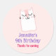 Un pegatina de cumpleaños con el ilustracion de un lindo gatito dormido. Los ojos cerrados parecen felices y pacíficos. Se coloca sobre un fondo rosa pálido.