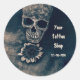 Cabeza de cráneo gótica vintage anticuada de pegatinas redondos de girasol blanco y negro. Guay Halloween inspiró a la tienda de tatuajes profesionales cuadrados materiales de marketing únicos. Derechos de imagen de Marg Seregelyi Photography.