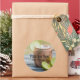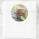 Restaurante, bar, taberna personalizado de plantilla pegatina. Pegatina redondo de tres pulgadas (o elija el tamaño más pequeño) con una foto de una bebida de la mula de Moscú en una taza de cobre. Agregue un nombre comercial y un número de teléfono o dirección utilizando las dos líneas de ejemplo, texto de plantilla en negro.