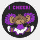 Un adorable diseño animador con un animador de monos con un uniforme morado y blanco con pompas moradas y un texto estilo equipo que dice I Cheer!