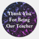 Este pegatina de apreciación del profesor presenta un fondo único de mármol en azul oscuro y violeta vibrante. "Gracias por ser nuestro profesor" aparece en el centro en blanco y puede ser personalizado para satisfacer sus necesidades. Este es un pegatina llamativo pero barato que hace que sea sencillo para usted ofrecer sus palabras de aprecio.