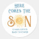 Esta pegatina de ducha de bebé de este lindo niño muestra el texto "Here Comes The Son" en una tipografía elegante azul y marrón con un sol de color amarillo sonriente. Personalizable fácil. Acuarela original © Michele Davies.