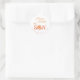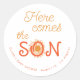 Sol naranja brillante aquí viene el hijo mamá futura nombre baby shower pegatina redonda personalizada