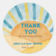 Única acuarela Sunshine temática Baby Shower Gracias Pegatina redondo clásico con colores Naranjas amarillo, azul y quemado.