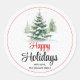 Árbol de Navidad al aire libre Feliz feriado Pegatina redondo clásico. Este diseño de árbol de Navidad al aire libre captura la esencia de la temporada de vacaciones con un hermoso paisaje invernal, mostrando árboles llenos de nieve y decorados con colores vibrantes. El audaz mensaje "Happy Holidays" es llamativo, complementado por delicados copos de nieve grises que se deslizan en el fondo, lo que realza el encantador ambiente invernal.