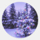 Púrpura con los mejores puntos de rosa y blanco. Árbol de Navidad iluminado por la noche en el bosque nevado a la luz de la luna.