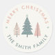 Pegatina de Navidad redonda con árboles pastel, tipografía moderna y diseño festivo en un estilo escandinavo minimalista.