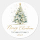 Elegante y moderno Guión dorado Watercolor Árbol de Navidad Navidades Familia Pegatina Redondo Clásico. Presentando un guión escrito a mano con letras de bonito Caligrafía con "Feliz Navidad", nombre de familia y año. Ideal para la temporada de vacaciones de los Navidades, fácil de personalizar con tus nombres e información del año.