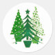 Estas bonitas pegatinas redondas tienen tres árboles de Navidad o de fiestas decorados y en macetas en diferentes tonos de lámina verde simulada con bordes dorados.