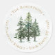Esta etiqueta de dirección de retorno circular de Navidad rústica y elegante presenta 3 árboles de pino de acuarela invernal nevados en el centro, con el nombre y la dirección alrededor del borde.