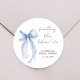 Etiquetas elegantes para tus invitaciones de despedida de soltera, recuerdos y tarjetas de agradecimiento con una acuarela elegante de un arco coqueto azul, "algo azul antes de hacerlo" en una letra moderna, y el nombre de la novia y la fecha de la fiesta en letra simple.