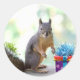 Una ardilla posa entre dos regalos envueltos de colores en esta fotografía original.
